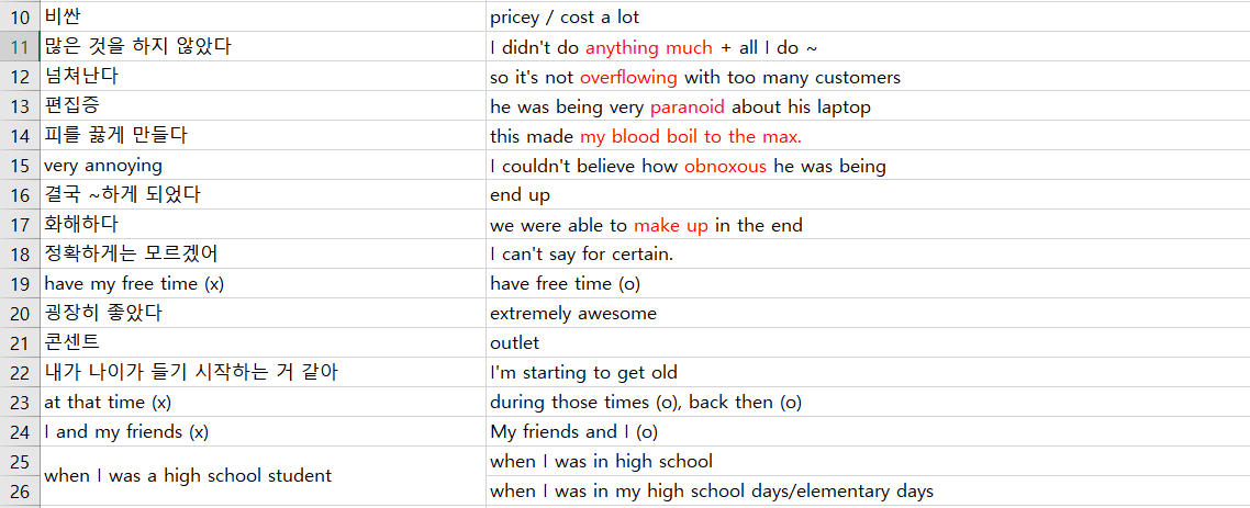 첫번째 열에 1) 한국말 2) 틀린 영어 3) 구린 영어를 적고, 두 번째 열에는 맞는 영어, native스러운 표현, 동의어 등을 정리했다.